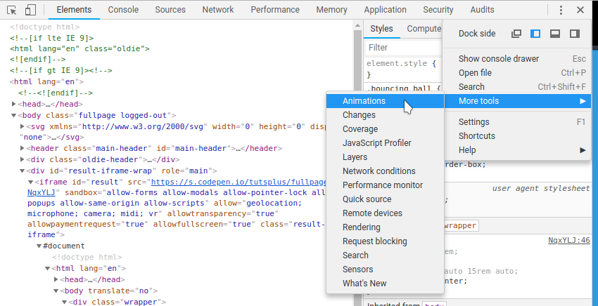 - Open the animation tools by first opening Chrome Dev Tools, then under the dev tools menu choose More tools > Animations.